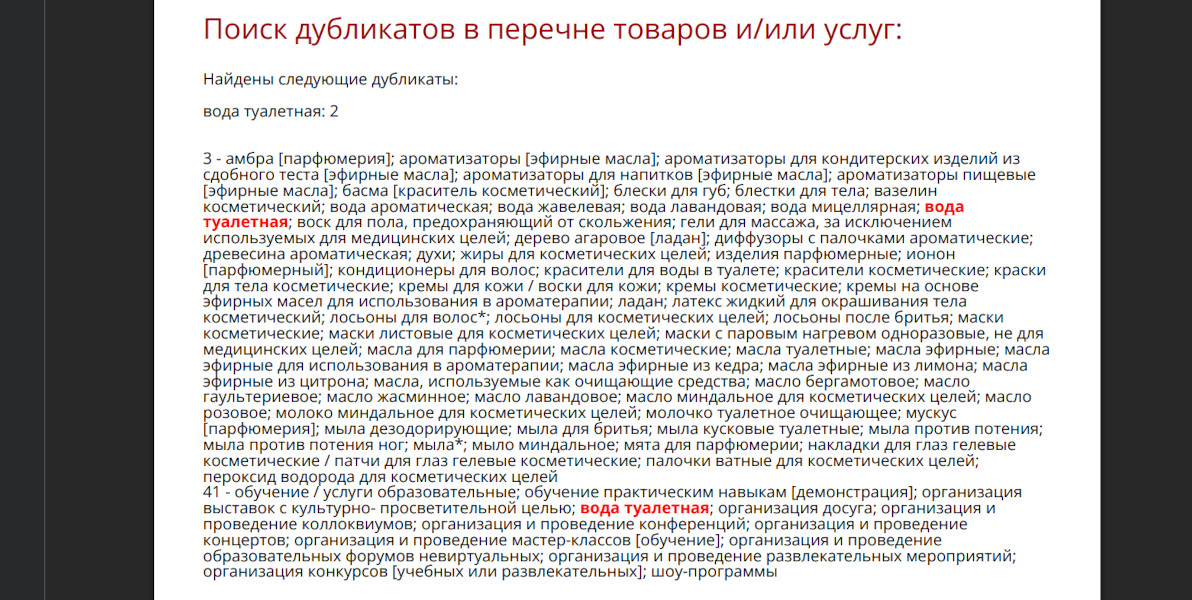 При составлении перечня товаров и/или услуг для регистрации товарного знака, некоторые товары или услуги могут случайно попасть в перечень несколько раз.IP-Механика может быстро найти и показать повторения в перечне товаров и услуг.